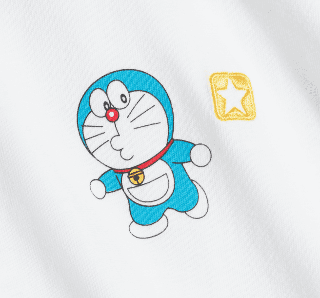La propuesta de ropa continúa la historia con una sudadera con capucha de felpa francesa y camisetas de algodón tipo jersey, cada una con audaces gráficos de Doraemon impresos con tinta de goma o a base de agua. Una mochila de edición limitada completa la colección, diseñada con un estampado integral de las expresiones coloridas de Doraemon y detalles funcionales que hacen referencia a su bolsillo cuatridimensional —un lugar donde todo es posible.