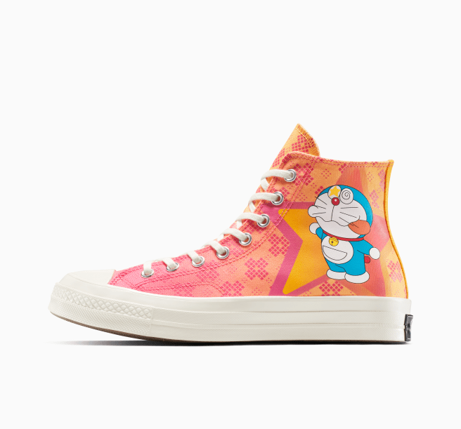 Liderando la colección está una vibrante versión del Chuck 70 con audaces toques de color tropical y estampados expresivos de Doraemon que saltan del lienzo, capturando la energía alegre del personaje. Una placa de licencia personalizada y plantillas co-marcadas añaden detalles coleccionables, mientras que la construcción de alta calidad garantiza que el calzado se sienta tan bien como se ve.